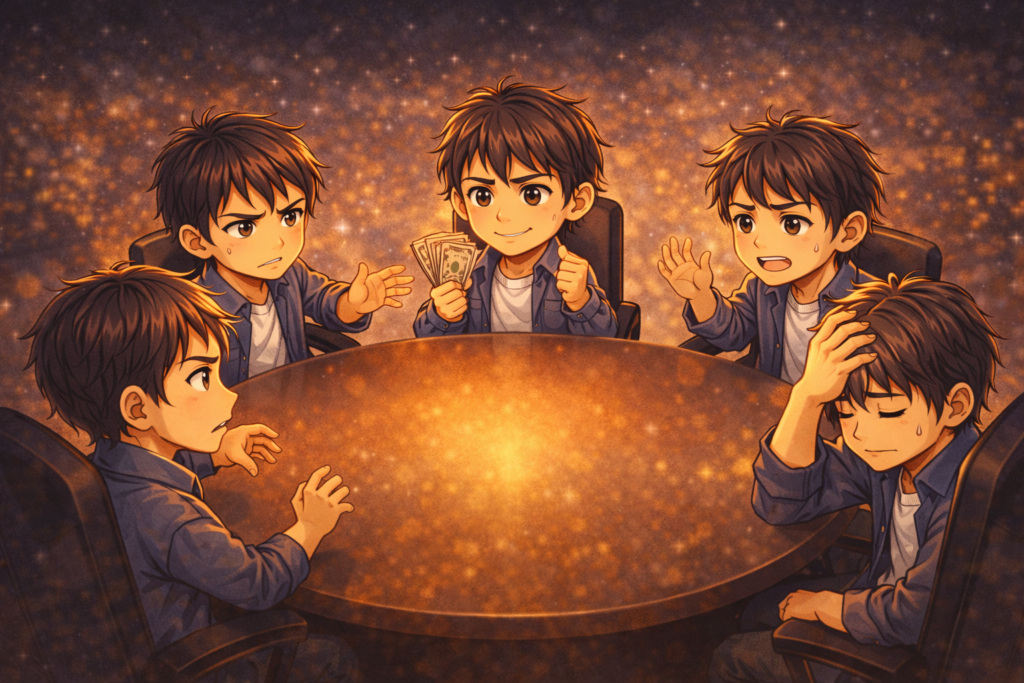 持っとる金が多いほど「まだいける」って会議が長引くけん、物理で短縮する。